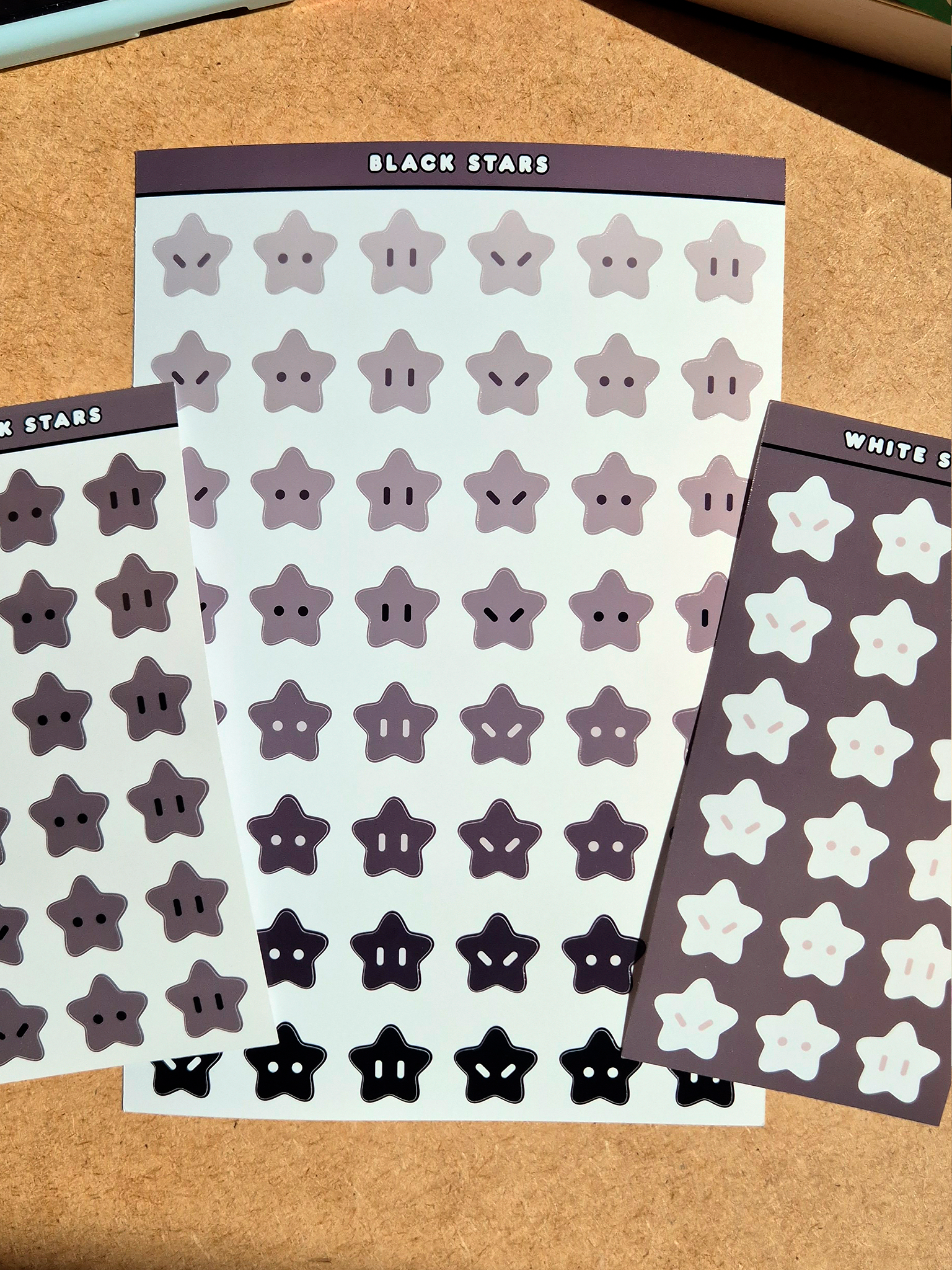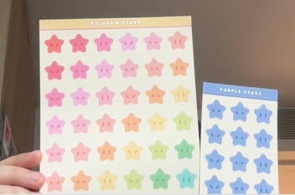 I got the matte rainbow star stickers which are perfect for journaling! All the stars are cut perfectly and the colours are a beautiful warm pastel. I have also gotten other glossy/holographic stickers in the past which have survived being on a water bottle. High quality stickers perfect for any need!